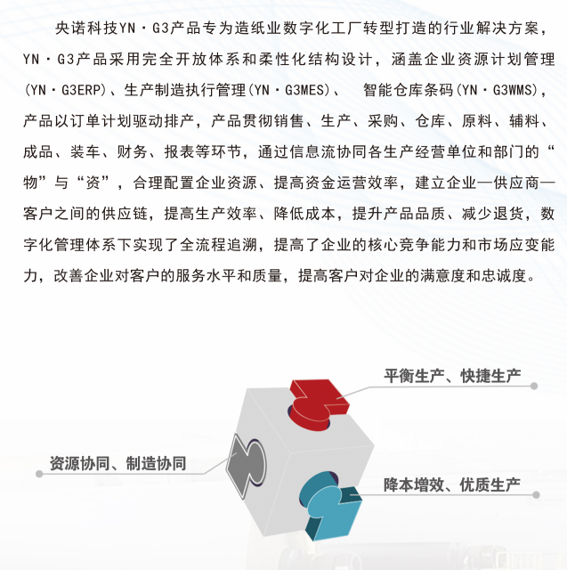 央诺造纸业G3®ERP”系统将传统造纸企业从【松散体系】向【数字化、体系化】转型,统一规泛、统一数据,消除业务信息孤岛,集成优化“人、机、物、法、环”在生产计划、能力计划、物料需求计划等方面决策支持,提高计划编排的科学性、准确性及透明度,避免计划的反复调整和波动。实时整合企业各部门实时数据及目标、计划,并将执行情况及时反映,提高企业的整体运作水平。