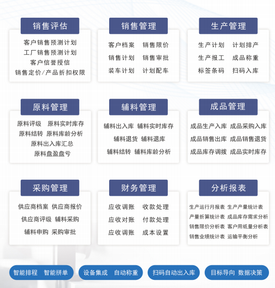 将传统造纸企业从【松散体系】向【数字化、体系化】转型,统一规泛、统一数据,消除业务信息孤岛,集成优化“人、机、物、法、环”在生产计划、能力计划、物料需求计划等方面决策支持,提高计划编排的科学性、准确性及透明度,避免计划的反复调整和波动。实时整合企业各部门实时数据及目标、计划,并将执行情况及时反映,提高企业的整体运作水平。